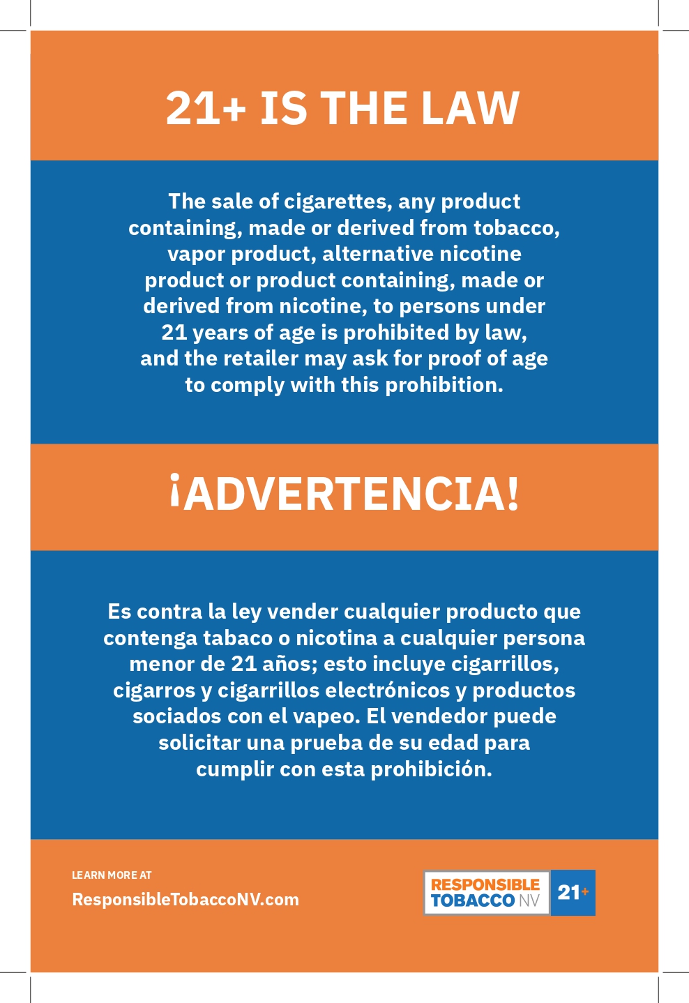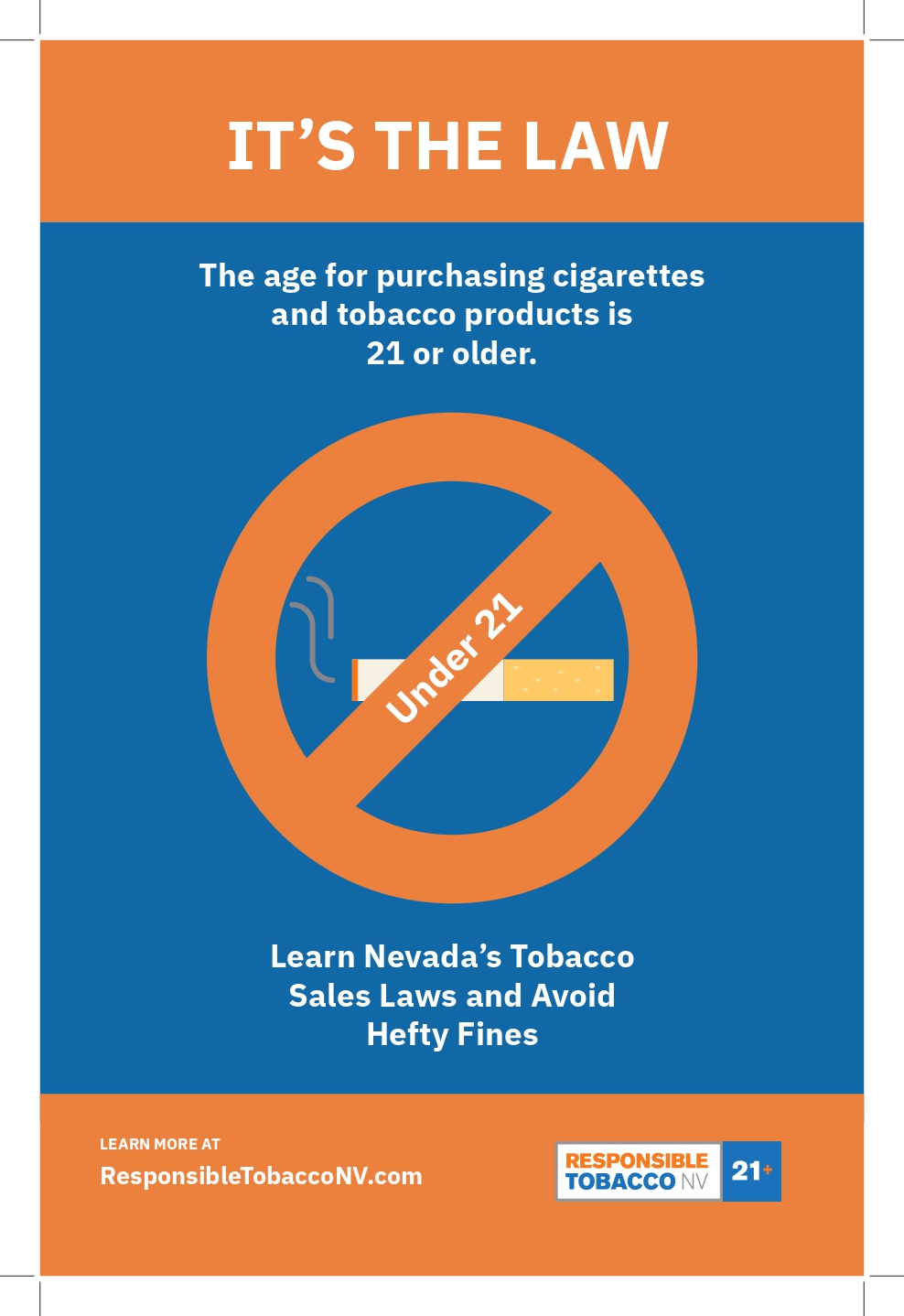 Selling tobacco to those under 21 in retail settings in Nevada is illegal. Tobacco retailers play an important role in protecting children and adolescents by complying with the law and regulations.